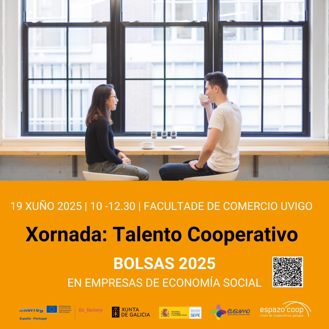 Xornada informativa: o 19 de xuño en Vigo, de 10 a 12.30 h., EspazoCoop celebrará a xornada Talento Cooperativo, no salón de actos da Facultade de Comercio da Universidade de Vigo, rúa Torrecedeira 105. Abordará a traxectoria e resultados do programa ata agora, e se informará sobre a edición 2025.